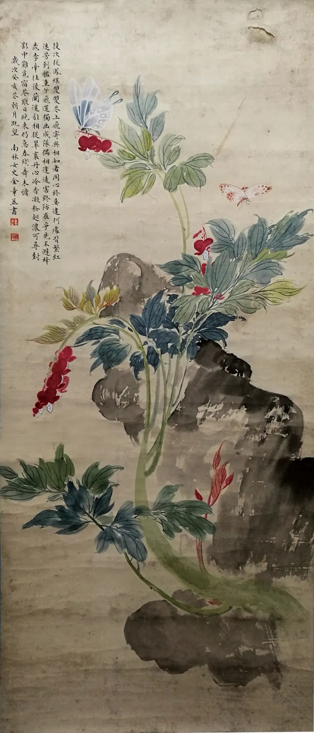 全画近处的大部分位置分别用淡石绿、淡花青,以小写意的笔法勾勒出花的枝叶,用大红画出三串花束;用淡花青、淡赭石以及白粉分别勾勒出两只蝴蝶,一只停驻花头,另一只在花枝间翩翩起舞。背景则是用淡墨以大笔随意皴出一块大石头。整个画面淡雅闲适、生动多姿,神韵直追清代扬州画派著名画家华嵒。在整幅画的左上角处,金章以一手劲健有力、工整漂亮的小楷题写款识,令人一看此画即感觉到一股晋唐风韵、文人气息的充盈,有如午后细品香茗。