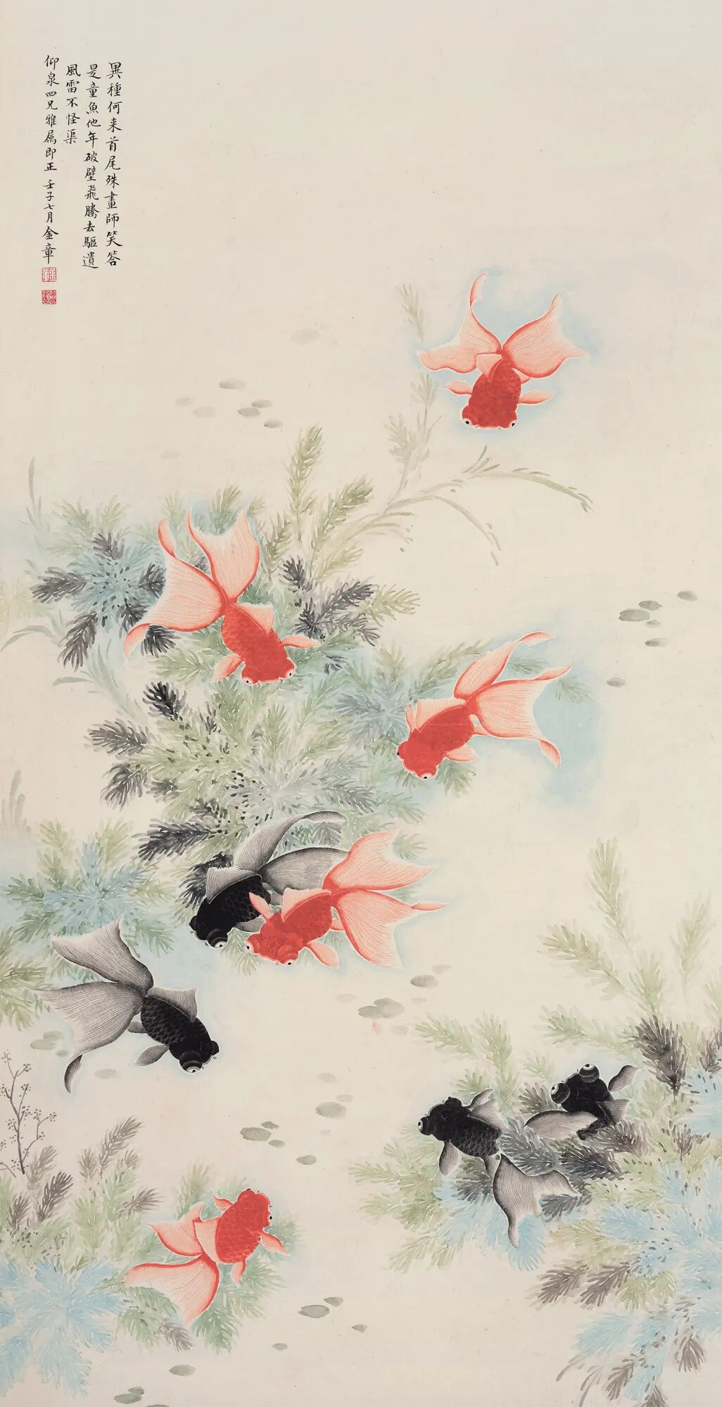 金章一生与鱼结缘,爱鱼、养鱼、画鱼,无鱼不欢。无论是在南浔的“可读庐”,还是在北平的“芳嘉园”,她都蓄养了大量金鱼。在她所有的作品当中,画得最多的是鱼,令她在艺坛上赢得一片赞誉的也是鱼。
