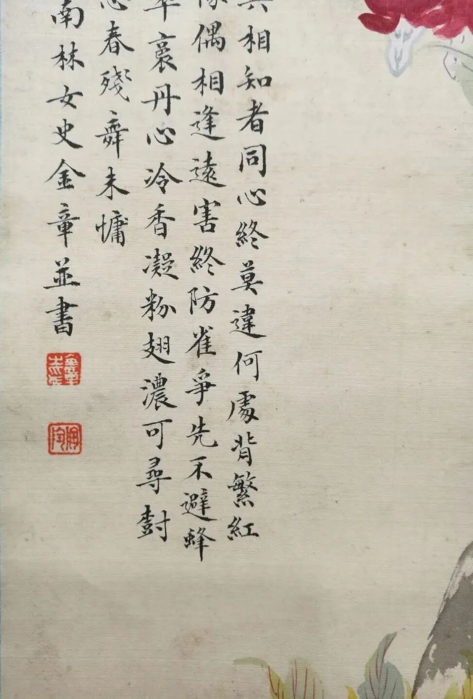 款识:复次从凤蝶,双双花上飞。寄予相知者,同心终莫违。何处背繁红,迷芳到槛重。分飞还独出,成队偶相逢。远害终防雀,争先不避蜂。桃李牵往复,兰迳引相从。翠裛丹心冷,香凝粉翅浓。可寻树影中,难觅宿花踪。日晚来仍急,春残舞未慵。岁次癸亥花朝月既望,南林女史金章并书。