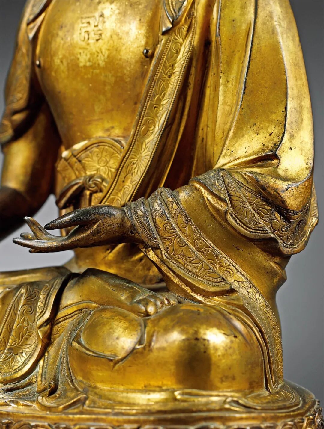 康熙宫廷佛像的佛衣吸取了明代造像的特点,线条流畅排布,塑造出纺织物的垂坠感,在佛衣的边缘和裙角喜用阴刻花纹。此尊佛陀身披袒右肩式袈裟,腰系长裙,衣褶贴合身体结构,弧线如行云流水,纹线分布优美,造型立体灵动,将衣料柔然、垂坠的质感表现得淋漓尽致。腿部衣纹呈放射性在莲座顶面铺开,衣料如波浪向两侧蔓延、伸展,呈现出如在梵天净土般的庄严与静谧。此尊衣料上錾刻有繁密的纹饰,以细致优雅的线条刻画出盛放的莲花、牡丹等各色花卉,这种精致的卷叶蔓纹与盛开的花瓣常见于同时期的官窑瓷器,参见故宫博物院藏,清康熙御制蓝地珐琅彩缠枝牡丹纹碗,以及台北故宫院藏,清康熙御制黄地珐琅彩牡丹纹碗。除了富有康熙宫廷特色,此尊佛衣纹饰的另一特点,在于花卉种类丰富,数目亦繁多,且姿态各异,不见重复;刀法灵动,在严谨细腻中见飘逸之美,富丽堂皇的同时又富有生机和活力,用极致的工艺呈现出顶级宫廷艺术品的丰美与华丽。