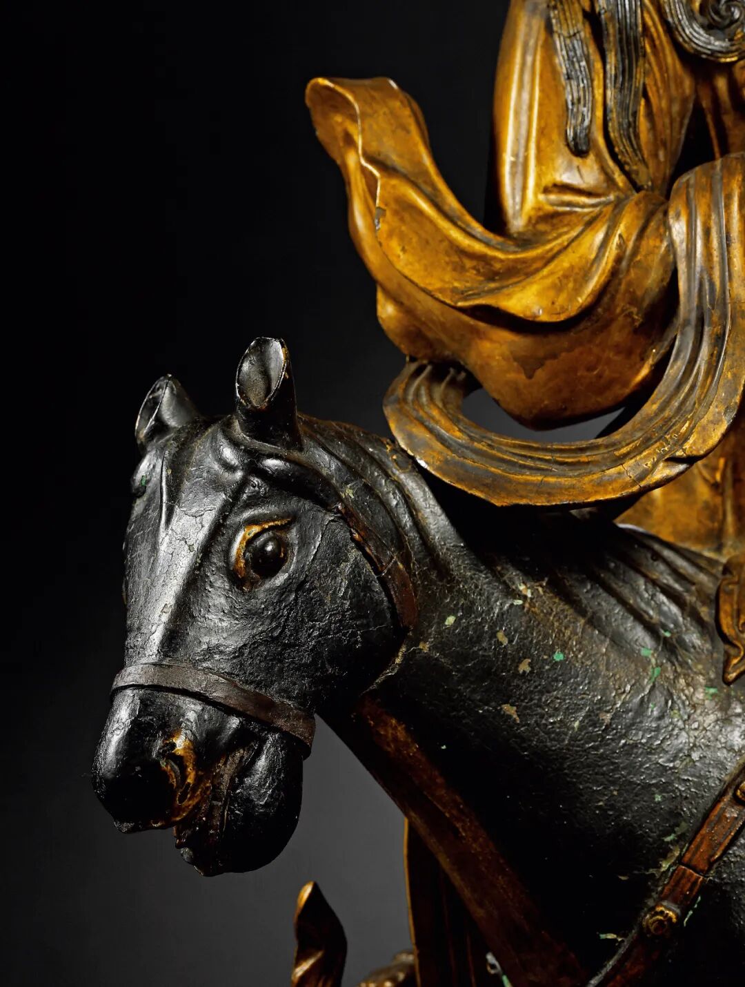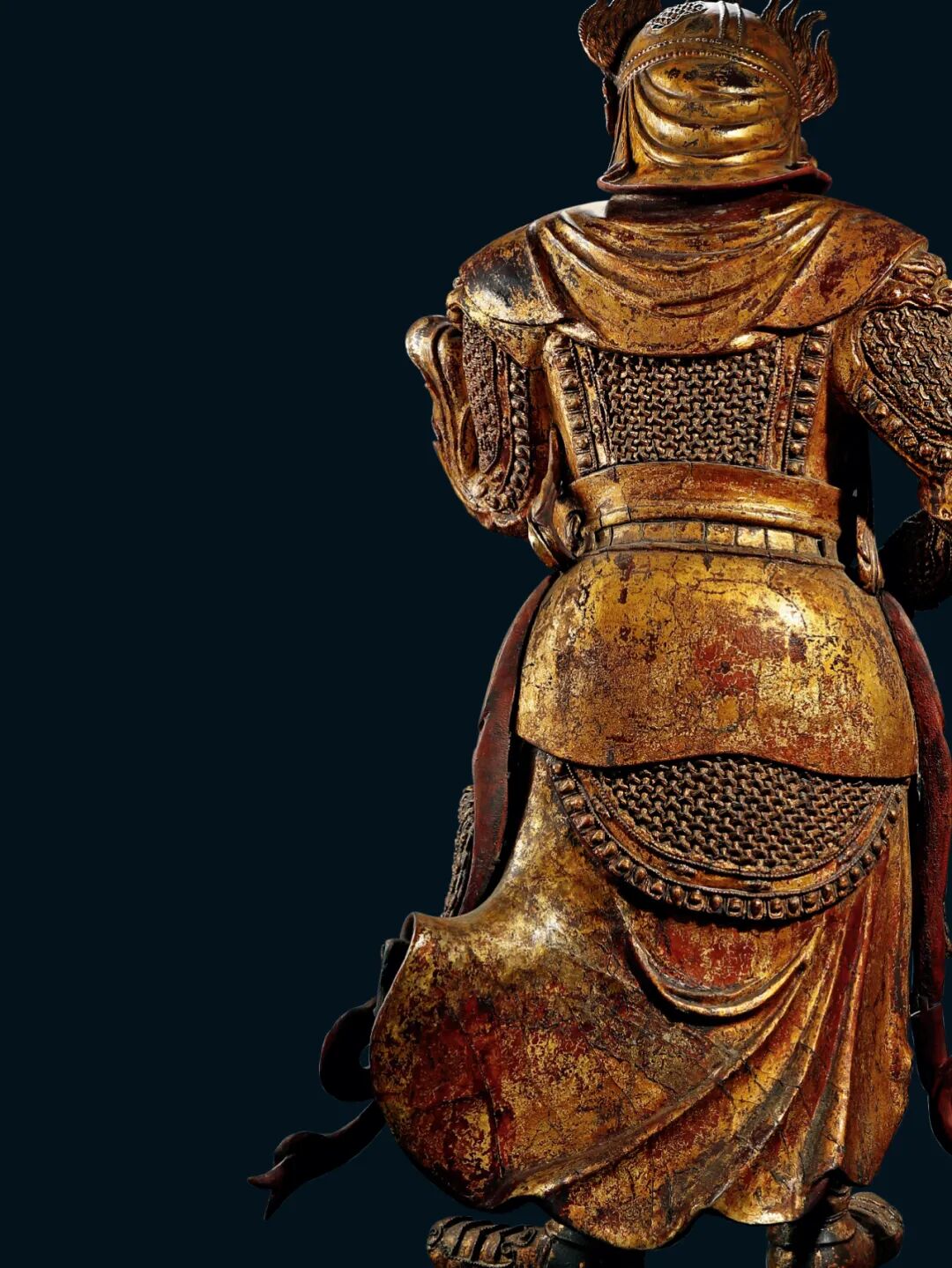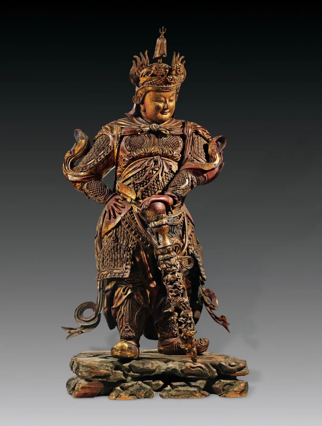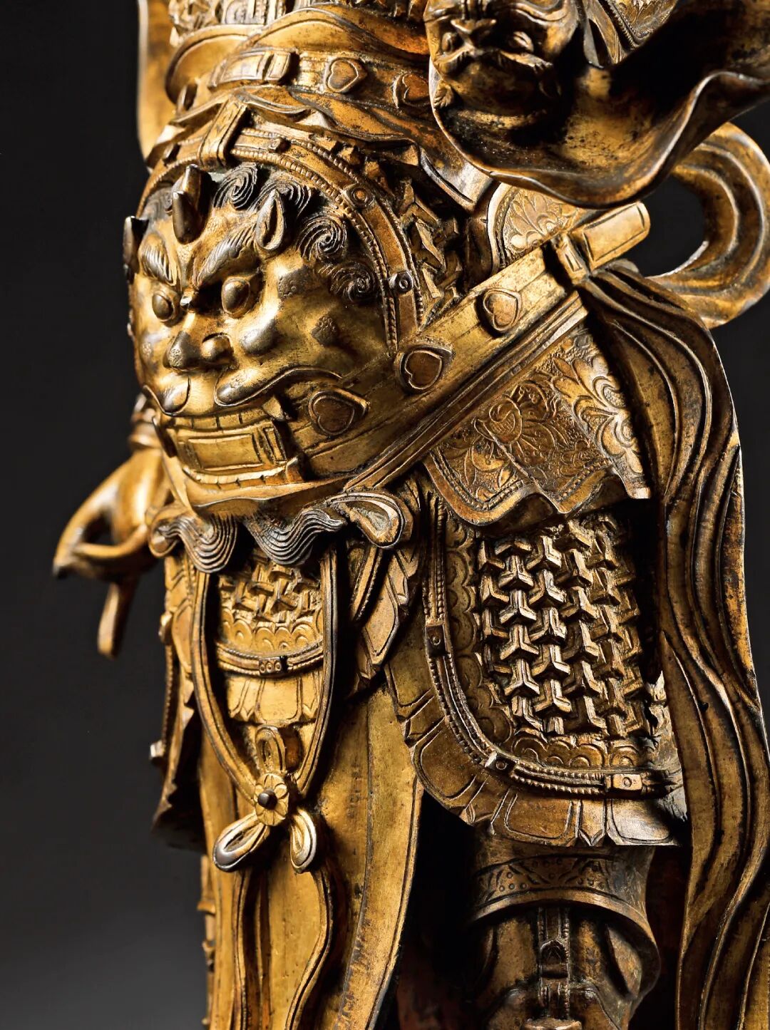 在精致、繁复、细腻和生动的艺术表现上,此尊护法都明显优于目前所见的大部分明代武像,相似的造型与装饰可参见北京翰海2012春拍的木胎韦驮,其造型和技艺极为相类,不论造型体态,壮硕厚实,乃至于木雕材质,髹色金漆等,都与本件天王木雕拍品如出一辙,具备明代宫廷御用监制作工艺特征。此像代表了古代雕刻的高超艺术水平,极有可能出自皇家造像机构,只有具备足够财力、物力和优秀工匠的皇家机构,才能够创造出如此伟大的艺术作品,虽历经数百年的时代变迁与风雨沧桑,依然掩饰不住他的艺术辉煌,令人赞叹。![]()
