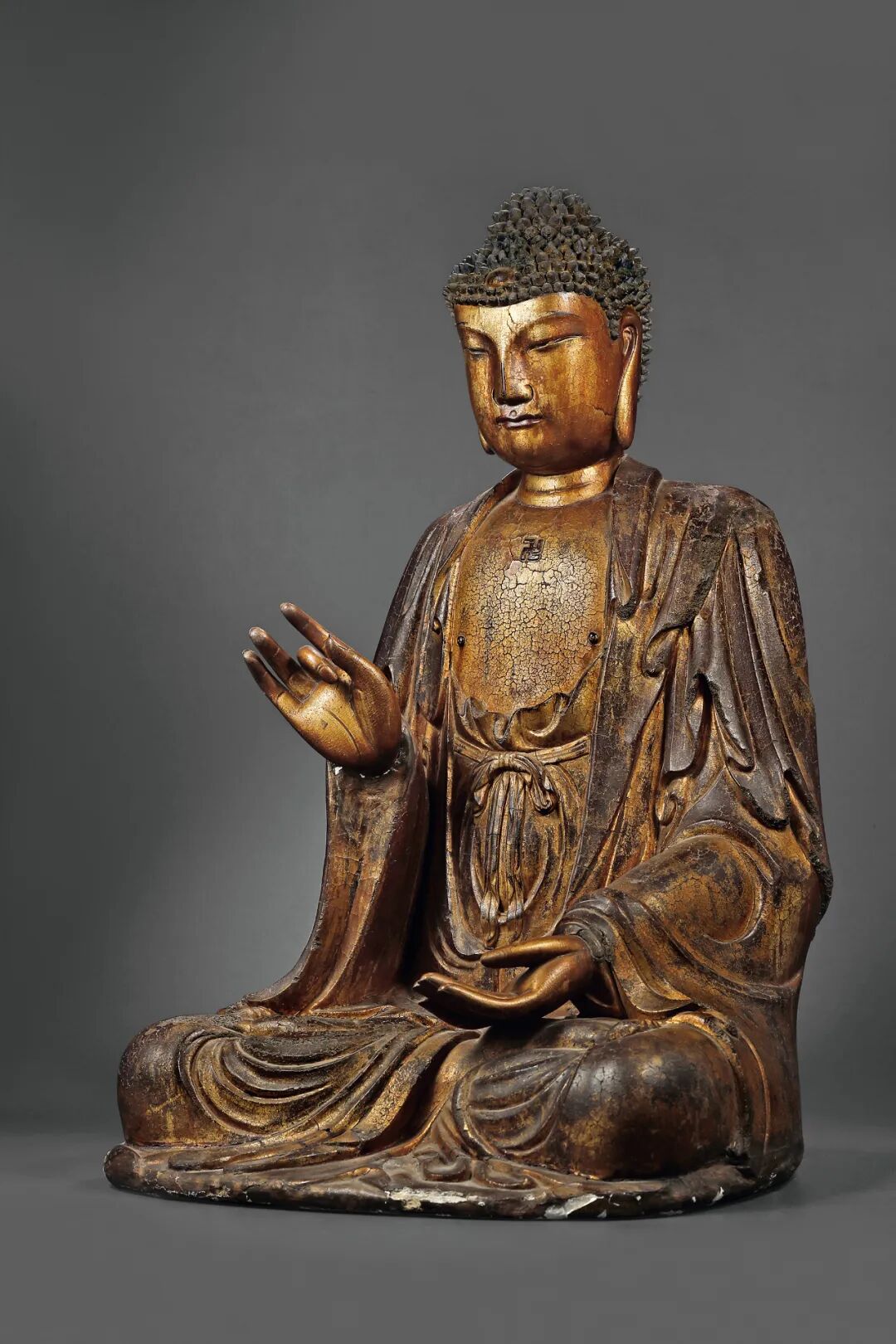 因年岁久远漆质开片呈蛇腹纹,整身体量巨大,品相完美,雕刻艺术水平极高,更完美诠释了佛陀「相好」的特征,不仅面部神态庄严、慈祥,身姿同样富有美感。流畅的服饰线条与斑驳的岁月之痕,尽显佛像历经的悠悠岁月,成就了一件典型的宫廷风格古代雕塑艺术品。夹纻佛像本身具有生命力,漆料独特的质感,与人一种亲近感,数百年的时光也如赋予材质独特的韵味,这种韵味封存在造像的「包浆」或「皮壳」中。尘灰、汗水、空气中的水分、经久的摩挲擦拭、烟熏火燎,在佛像表面上层层积淀,逐渐形成表面的皮壳。这些以造像为 载体的岁月留痕,显露出温存的旧气,更自然 温润,更能打动心灵。![]()