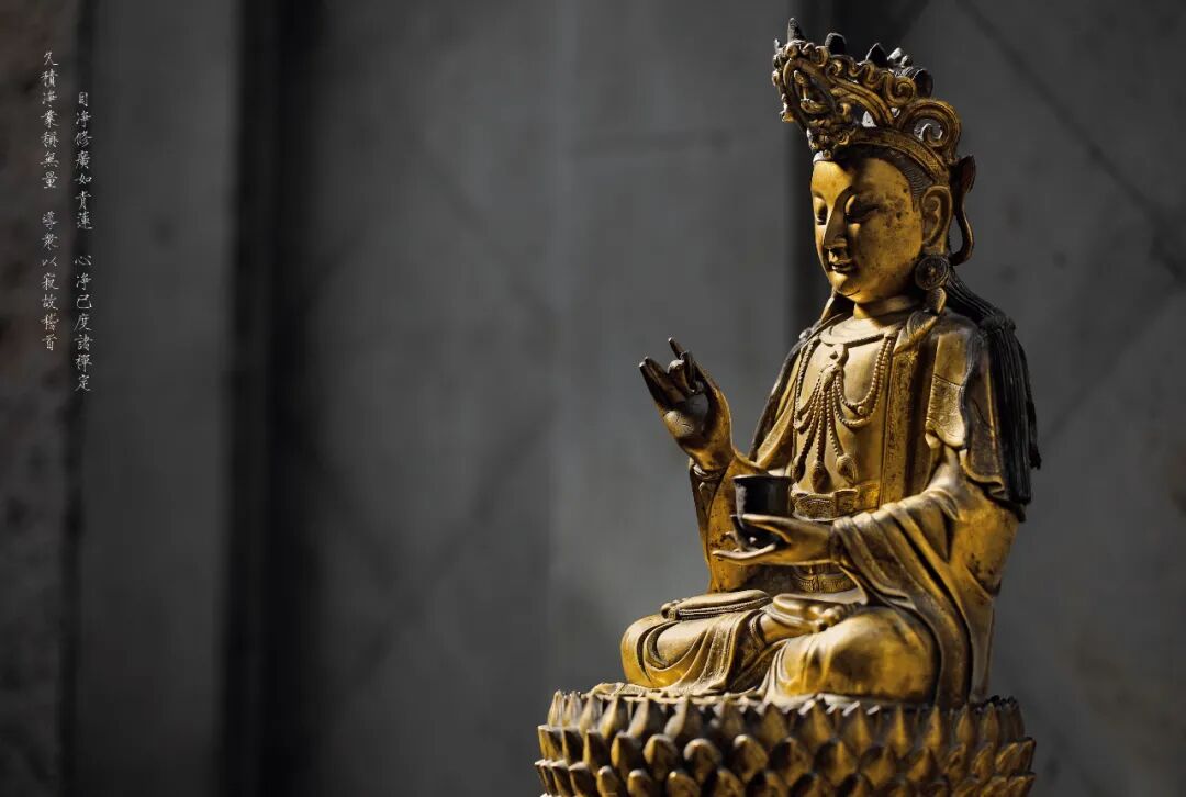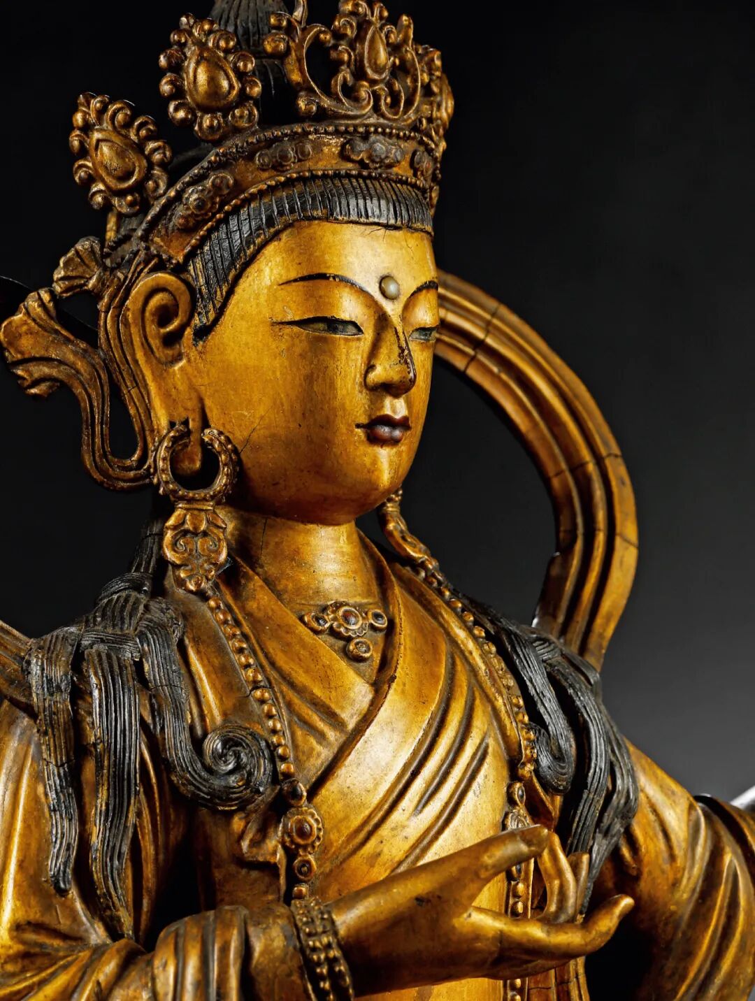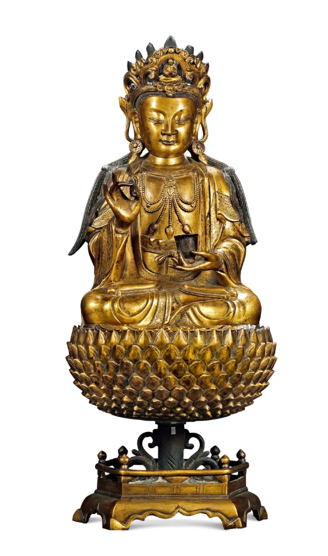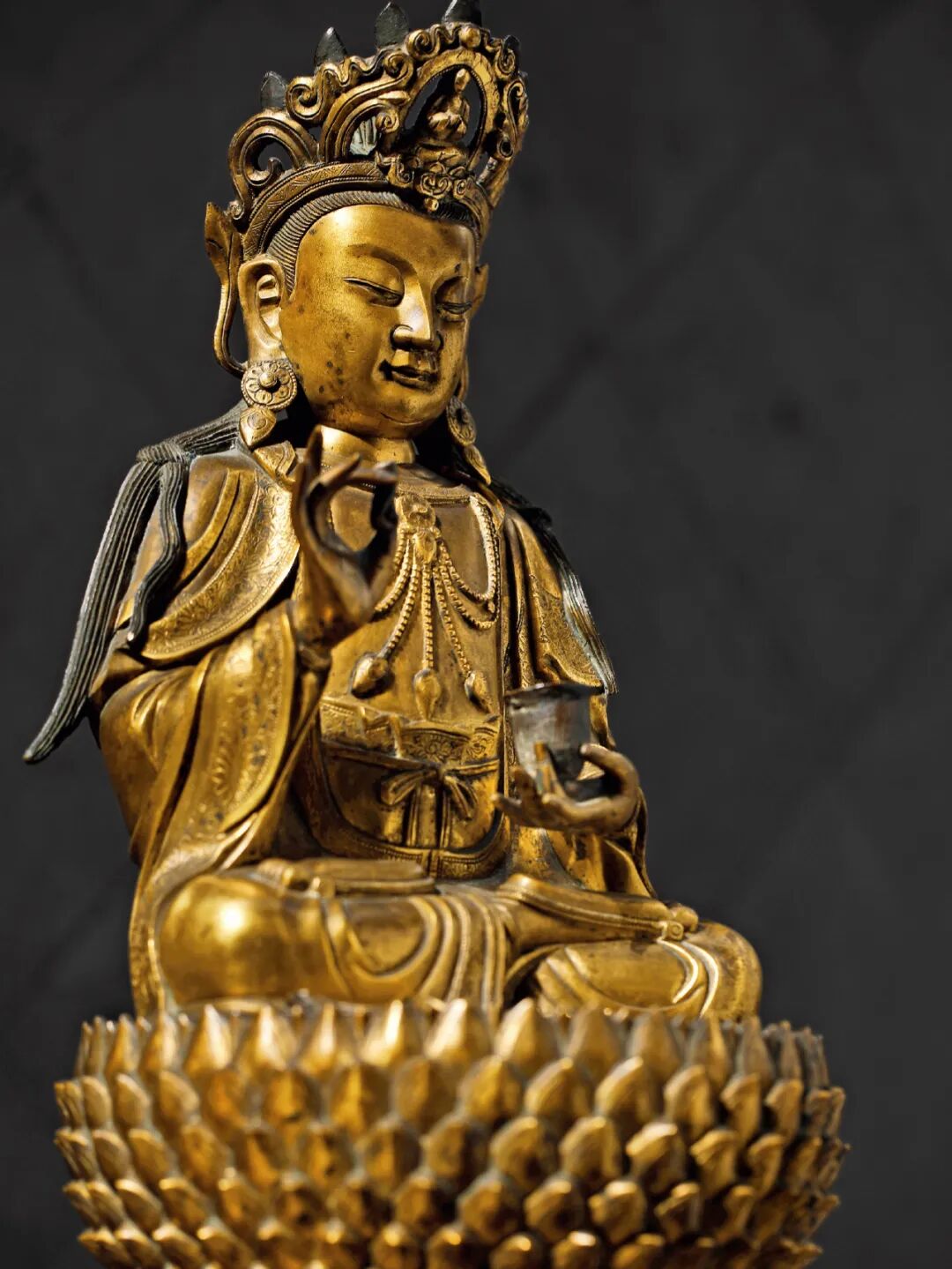 这尊像是明代中晚期汉地观音造像典型样式。观音头戴天冠,冠正面有化佛阿弥陀佛,头顶梳成高髻,高额宽面,五官端正。双肩横披天衣,胸前饰璎珞,下身着裙。结跏趺坐,左手于脐前托净瓶,右手拇指与中指相合,持一杨柳枝,做出以杨枝醮水向外挥洒的姿势,表示以大慈悲遍洒甘露水,为众生消灾避难。身下是八层满莲瓣莲花座,朵朵莲瓣向外伸展,刚劲有力,整体造型完美,金水保存完好,体量高大,工艺精湛,十分难得。