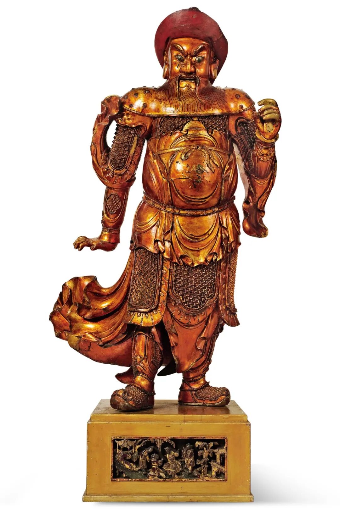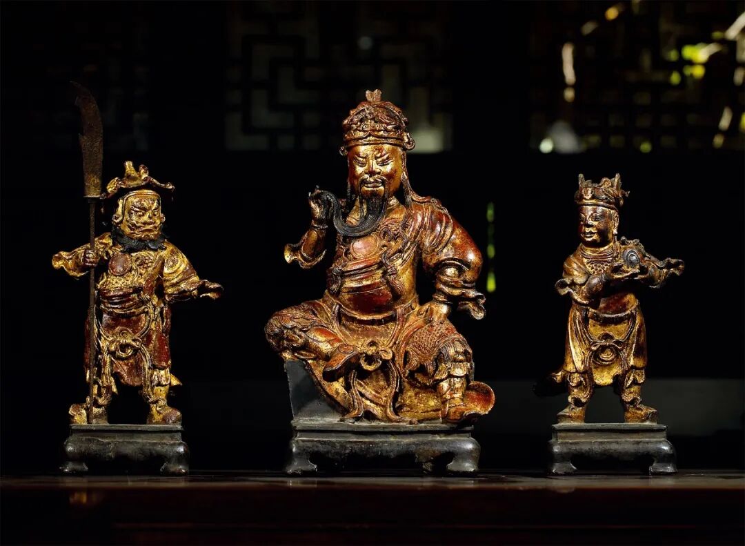 此组造像以精铜铸成,铜质精治重沉,质色具美,包浆醇厚,肥润老到,触手细润,光华暗蕴。关公正襟危坐于台座之上,膀阔腰圆,面庞方阔,眉眼上挑,浓眉交蹙,凤目微合,挺鼻丰唇,饱满威仪。留有五绺长髯,美须垂胸,右手轻捻长髯,气宇轩昂,仪态威严。刻画生动,低垂的双目和倒立的剑眉显露出一派威严和正气。关公头戴宝冠,身披战袍,内着甲胄,足蹬云头高靴,形象威武彪悍。腹、腿皆用鳞甲覆盖,手腕、足腕配有护套。左臂微屈扶于大腿之上,右臂举起捋须。仪态气宇轩昂,于静谧中透出威严。头冠、衣饰、铠甲雕刻的精细入微,且颇为写实,不同于传统造像的程序化处理。衣纹刻画简括自然,肘部衣袖随风飘起,战袍在双腿间自然下垂,整体姿态雄健有力。胸前护心镜采用宝石镶嵌,宝相端庄,更添贵重尊荣,体现了我国传统对关公的崇拜敬仰之情。雕铸工艺精湛,纹饰层次饱满,图饰精美细致,甲胄纹理清晰,刻画精细,繁而不乱,层次分明,打磨光滑,具有极强的立体感。关羽一生忠义勇武,忠贞不二,历代帝王均将关羽当做“忠义”化身,由侯而王,旋而进帝,最后被尊为武圣人而受世人崇拜。关公在汉传佛教中被奉为伽蓝菩萨,即寺院和守护城关的神。藏传佛教则认为他是密宗护法赤东赞的化身,道教尊之为关圣帝君,并赋予司财的职能,被尊为武财神。关羽为儒、释、道三教崇信,被尊为战神、财神、文神、农神,全方位的万能之神,为历代统治者和百姓万民所共仰,这种受到不同阶层、不同宗教崇拜的古代人物颇为少见。关公的封诰历朝不同,但有两个统一的评价贯彻始终,那就是“勇”和“义”,这也是关公像广受崇祀的原因之一。此组造像最难得之处在于,关公、关平、周仓为原始一组。殊为难得。