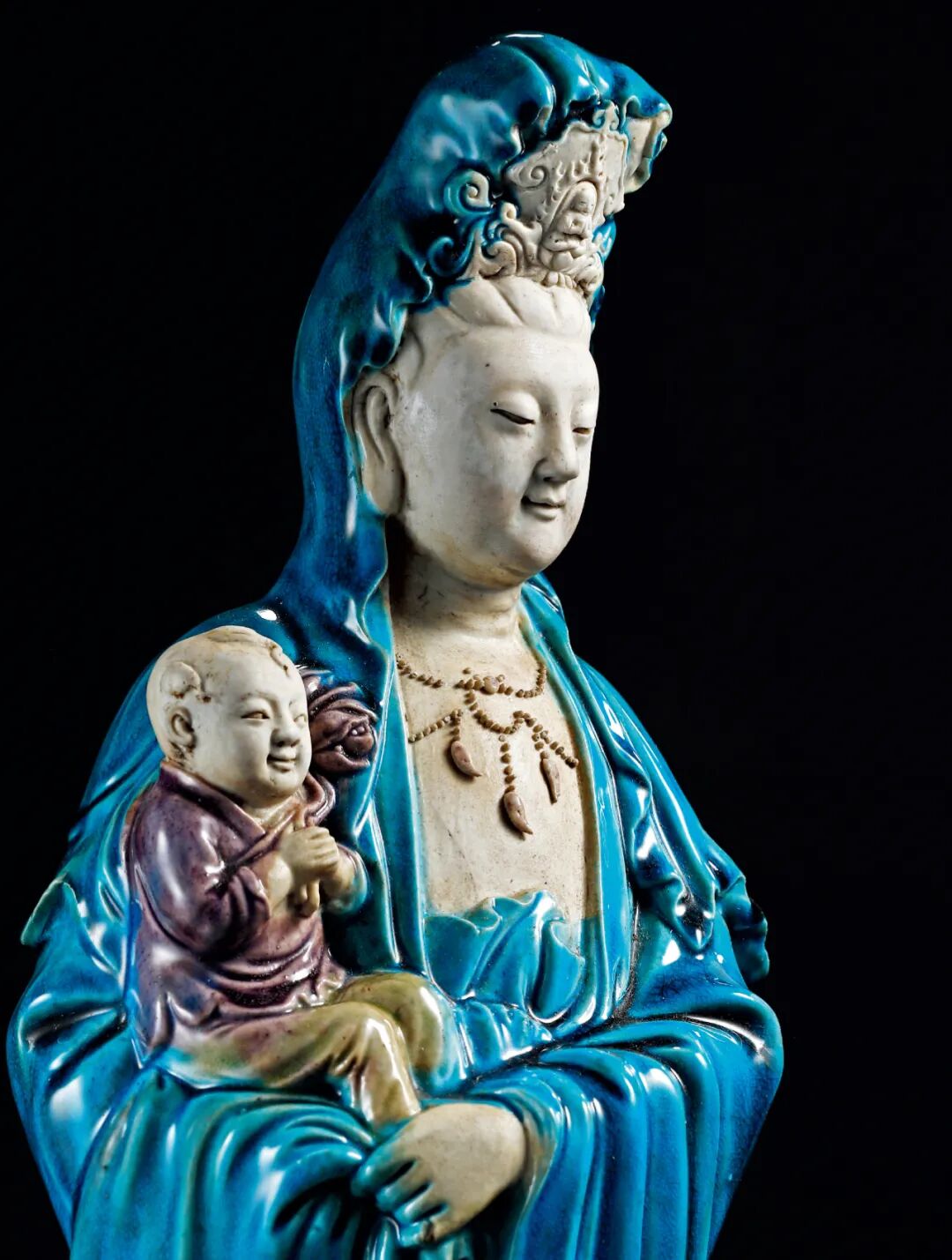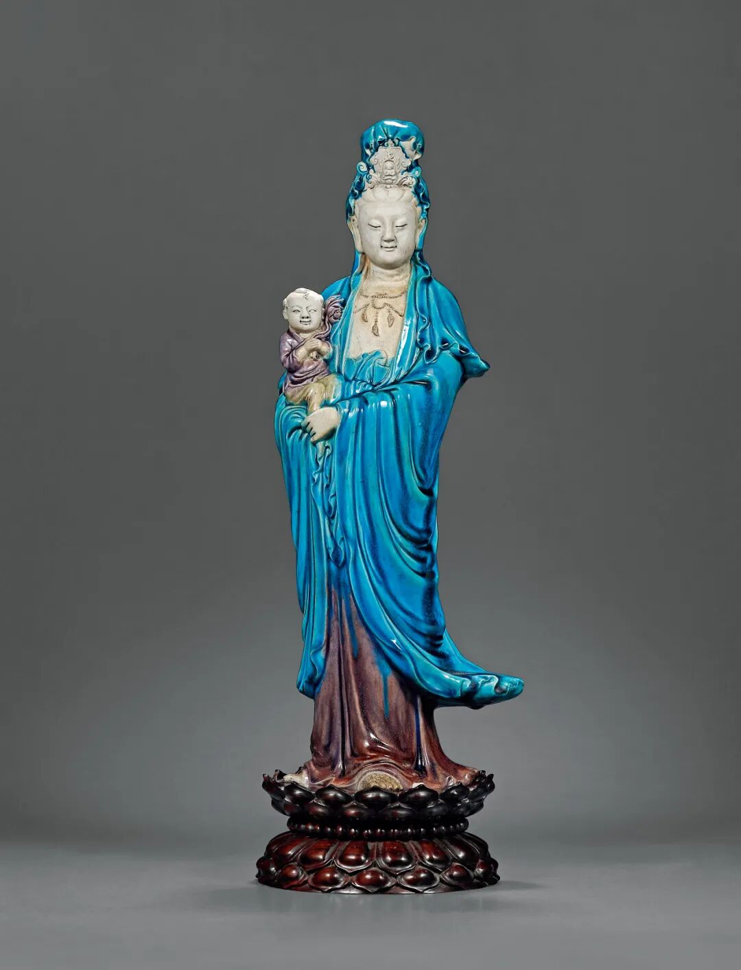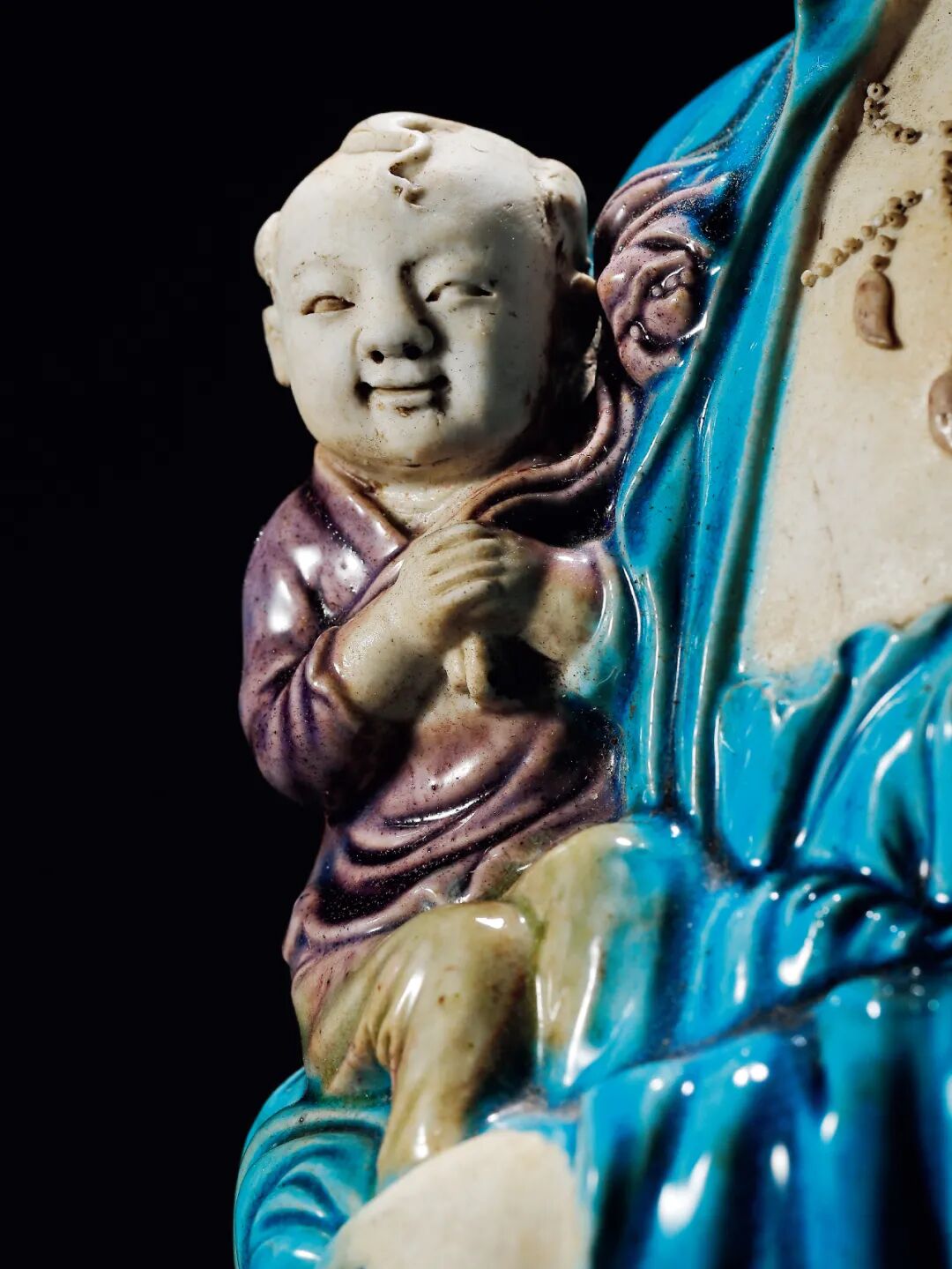 佳器必出良工之手,本品当为雍干时期督陶官唐英所督制。唐英字俊公,号蜗居老人、陶成居士,堂号陶成堂,沈阳人,汉军正白旗,生于康熙二十一年(1682年),卒于乾隆二十一年(1756年),自雍正六年(1728年)佐理窑务,先后榷窑二十余年,是御窑厂历史上督窑时间最长、成就最高的督陶官,督陶所制史称“唐窑”。此件清乾隆唐英制珐华釉送子观音立像是为乾隆盛世典雅的清宫佛像造型。又因成形复杂,烧造难成,因此其艺术价值和制作难度均在金铜佛像之上。佛像面部及衣褶细部处理非庸手可为之,运用雕塑、驳接等技法完成,处处需要异常审慎,而烧造过程更难人为控制,极容易变形疵裂。乾隆十三年唐英曾承命烧造观音,久造无成,乾隆皇帝就斥责唐英“烧造的观音如何还不得?”、“想是唐英不至诚,着他至‘诚’烧造。”(见乾隆十三年五月初一《清宫内务府造办处活计档》之《记事档》)以唐英督领下御窑厂水平之高独步有清一代,纵然如此尚有难为之处,可想神仙塑像烧造之不易。出于对神灵的敬畏,此类雕塑神像多不具年款,有别于鎏金铜像落“大清乾隆年敬制”款者。