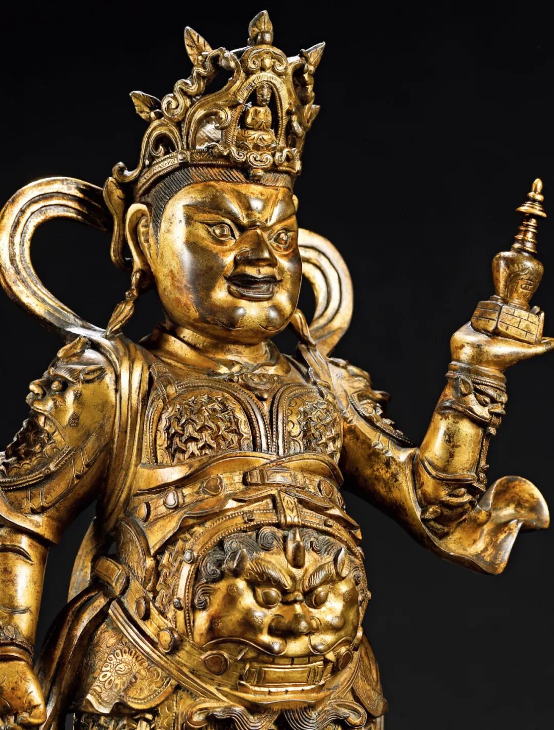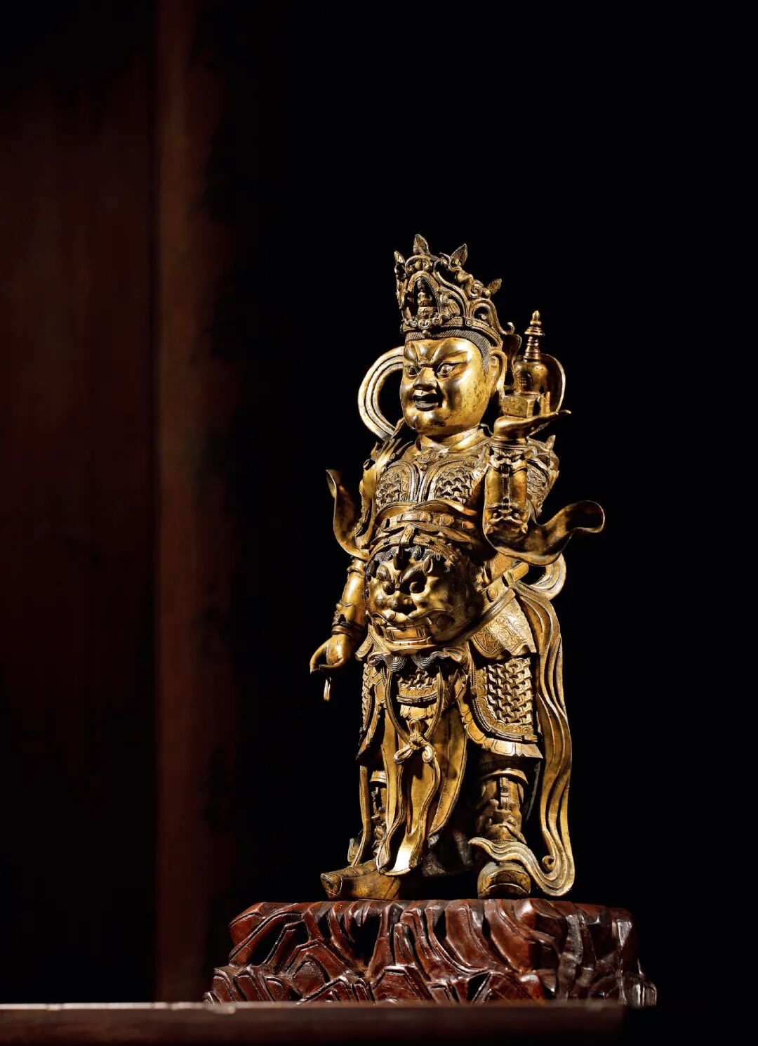 此尊造像为典型的明代汉传佛教所供奉的托塔天王像。双腿站立于岩石形台座之上,右手持三叉戟,左手举托宝塔。宝塔和三叉戟是托塔天王身份的重要标识。天王头戴宝冠,顶束高髻,耳侧缯带飞扬。面部肌肉凸显,双眼怒目圆睁,鼻梁短蹙,下颌及两腮蓄有浓密须胡。身着甲胄,足蹬云头高靴,形象威武彪悍。甲胄的形制完全依仿古代武士装束,其胸、背有两块铜镜保板,腹、腿及臂部用鳞甲覆盖,两肩、手腕及脚踝上配有兽头护套。形式虽然纷繁复杂,但刻画精细,层次分明,而且具有极强立体感。身后披有飘曳大帔帛,突出了天王不同于一般武士的宗教神性。造像整体造型大方,形象生动,雕工精细,品相完美,体现了明代中晚期汉传佛教造像鲜明特点。