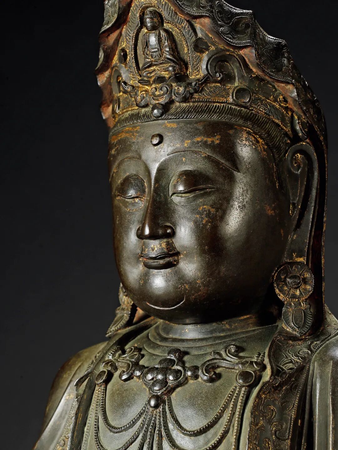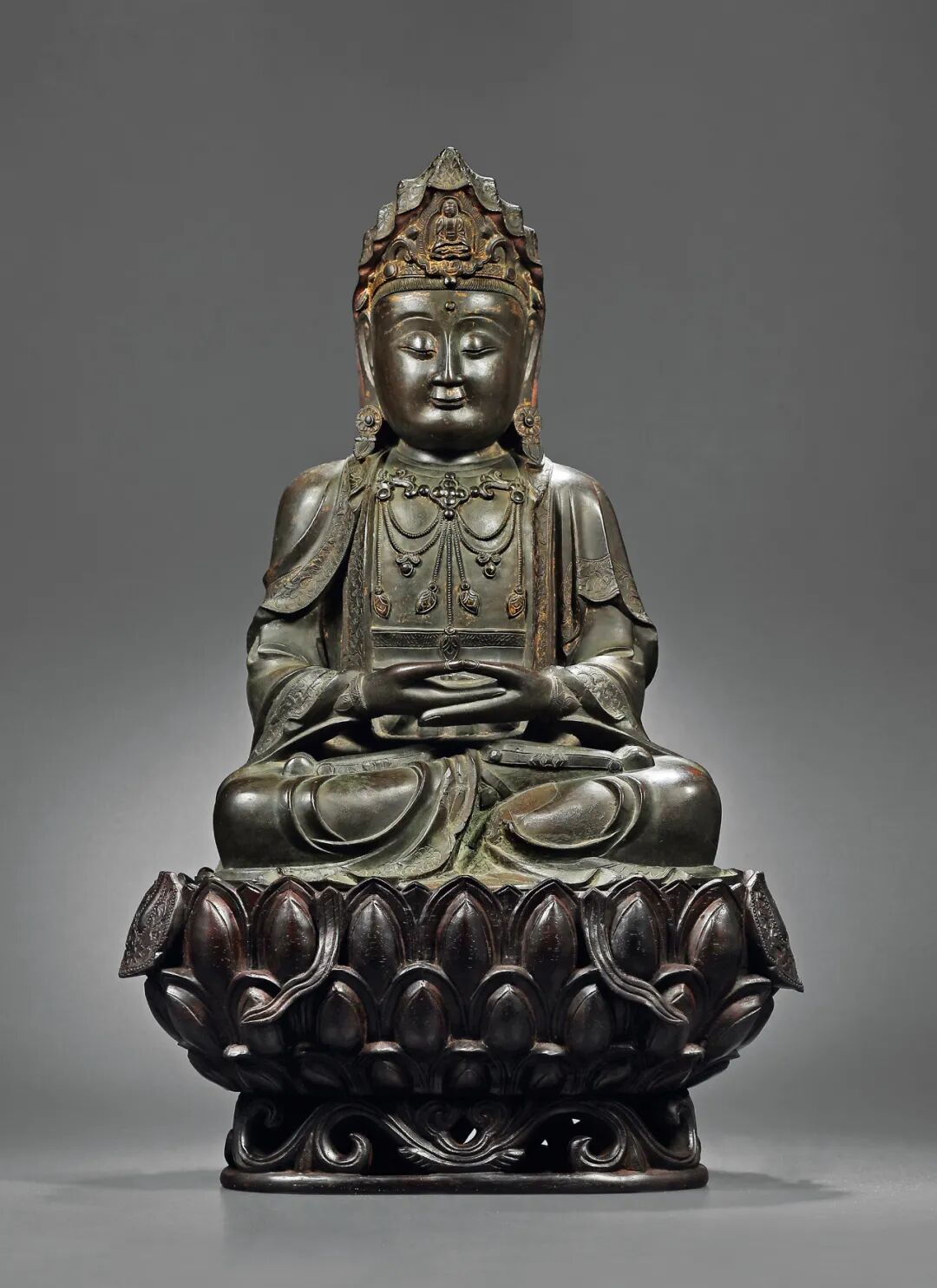 明代佛教造像艺术发展到了嘉靖时期,又回到了汉传佛教艺术风格的道路之上,然而受藏传造像影响的部分不但没有消失,反而是更加融合一体,使内地汉藏风格造像得到更好的发展。如此大尺寸精美的观音菩萨坐像应是明代嘉靖或万历年间宫廷或皇家寺院所供奉的佛教造像。观音结全跏趺坐,双手结禅定印。面相丰颐圆润,曲眉似弯月与鼻梁相连,眼睑较宽,神态慈和宁静,典型的明代汉地造像面相特征。双眼微合,俯视前方,仿佛正在冥想之中,又似在出神聆听,寻觅众生求助的呼声,应声前去解救。头戴花冠,冠叶雕刻精细,并向外倾斜,这与藏式风格略有不同,融合了内地造像的审美情趣。身躯雄健,结构匀称,体态优美,整体给人庄严神圣而又慈祥亲切的宗教美感。袈裟自头顶披下,衣缘处饰以精美的花朵纹饰,胸前饰璎珞,下身着高束腰及胸长裙,此为明代汉地菩萨造像常用装束。衣纹厚重写实,刻划自然流畅,衣缘上錾刻花纹,纹饰清晰,雕刻精细,鲜明的汉地造像装饰风格。整体形态端庄,雕刻细致入微,时代风格鲜明,为明代中晚期汉地观音造像经典之作。![]()