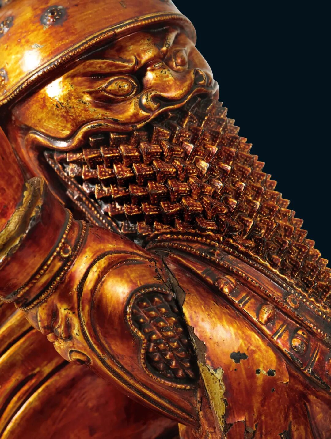 本尊韦驮体态魁梧,身着武将铠甲,纵然其开相如赤子般天真无邪,仍不失作为第一护法的威武气概,俨然一位颜值与实力在线的守护神形象。韦驮娃娃脸面相,五官小巧,双颊圆润饱满,苹果肌微微鼓起,眉眼弯弯,眯起的眼眸、上扬的嘴角似挂着满心喜悦,憨态可掬让人倍感亲切。面部刻画精彩到位,将这位“赤子将军”的悲悯祥和表现地淋漓尽致,与其对视顷刻,便能驱赶内心所有的阴霾。韦驮头戴凤盔,身着铠甲,足蹬战靴,护肩交领处蝴蝶结绑带与胸前的帛带、绳结及腰下中国结细腻精巧,自然柔软,迎风飞扬之姿态足以以假乱真,三者相得益彰,明显承袭了明代汉地造像注重写实的传统;飘带绕过双臂向上飘拂,好一番仙家气派,似与飘带相呼应,战袍下摆飘逸,不仅突出战袍轻柔,更柔和了盔甲的阳刚,进一步凸显韦驮刚柔并济,文武双全的非凡气度,艺术效果极强。铠甲遍布全身,甲片密布紧凑,刻画精良,每处范围甲片大小不一,样式各异:通体以山文甲为主,腰间处饰锁子甲,背饰及战袍下摆饰以鱼鳞甲为点缀,刻画一丝不苟,可窥见匠人心思之细腻,工艺之考究。韦驮颔首低视,左手按金刚杵,右手扶腰立于山石之上,腰胯部的“S”型曲线明显,威武轩昂。如此灵动之体态亦是此尊夹纻胎韦驮的一大优势之一。夹纻漆器主要由天然生漆、天然纻布及瓦灰等组成,工艺繁琐,虽难度极高但同时可塑性也非常高,正如飘带褶皱、铠甲纹样的区别、绳结样式皆交代得一丝不苟,每处细节都做到极致,散发出蓬勃的生命力,艺术水准之高超绝非一般作品所能企及,是为明代御用监韦驮天王像。