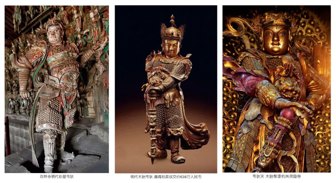 韦驮(梵文Skanda),本为婆罗门天神,神格尊阶地位极高,后被佛教吸收,成为主要护法之一。据《大慈恩寺三藏法师传》记载,唐代高僧道宣大师言曾梦见此神祗,自称:“弟子韦将军,诸天之子,主领鬼神,如来欲入涅槃,敕弟子护持赡部(即南赡部洲,佛经中世界四大洲之一,中国在此洲)遗法”。自道宣记述韦驮护法神迹,“诸天之子”韦驮护法作为中国青年武将的形象基本固定下来,其手持金刚杵,常被安置于佛寺中央天王殿后,守护大雄宝殿内主尊释迦牟尼佛。