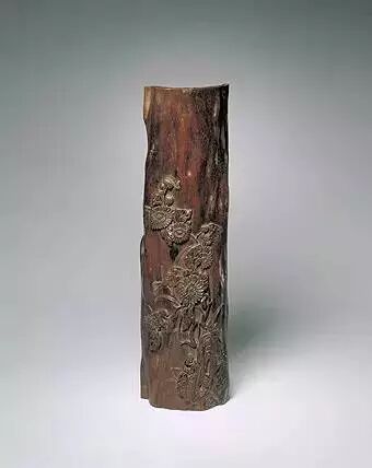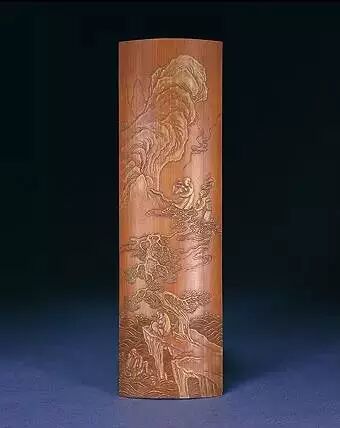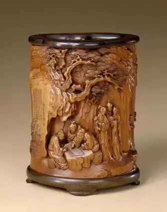 笔筒以高浮雕技法雕东晋淝水之战以寡胜众、捷报传送谢安的故事。雕刻层次清晰,虽然纹饰满布全器,但布局妥贴自然。尤其是谢安沉着弈棋、胸有成竹的神态,表现了运筹帷幄、落子必胜的信心和毅力,与策马疾奔的信使形成一静一动的鲜明对比,两部分图案既有各自的独立性,情节上又相互呼应,构图连成一体。山岩侧刻清乾隆帝御题诗一首,下方有楷书“古”“香”二小印及“槎溪吴之璠”、“魯珍”等款识。