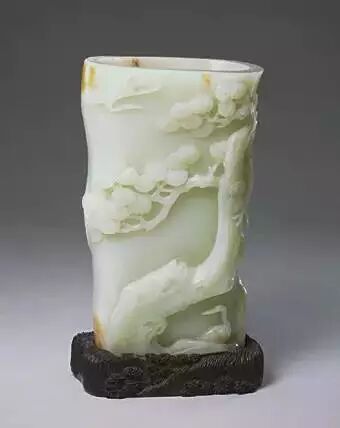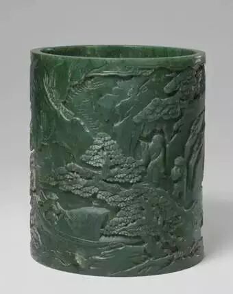 筒外壁高浮雕山水渔乐图,层次清晰,空间感颇强。画面古木森森,山下泊舟,山道上有老翁携童子拾阶而上,空中浮流云飞鹤。此器以碧玉雕琢,其色调与质地的润泽颇合于山林清幽、渔家逸乐之意趣。