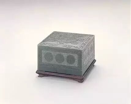盒碧玉质,正方形,盖面阴刻细蚕纹地,主题纹饰为4怪兽及四出戟八卦太极纹,周边饰勾形纹,盖四面立壁各雕3个章纹符号,共日、月、星辰、山、龙、华虫、宗彝、藻、火、粉米、黼、黻十二章图案。此盒一望而知为宫禁中帝王御用之器。
