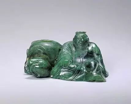 水丞碧玉质,局部有墨斑。其造型为圆雕人物和桃形容器,大小二桃相连,大桃内空,可用以盛水。人物醉意蒙眬,坐姿不稳,倾身斜倚,并以手扶膝相助。“太白醉酒”为古代工艺中常见的题材。