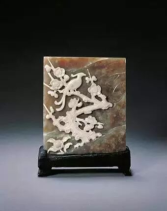 屏玛瑙质,长方片状。正面运用俏色技法利用原料上的白色巧加碾琢,山岩、梅花、凤鸟错落其间,衬以浅棕色的背景。背面阴刻隶书“御制探梅诗”,末署“臣琦善敬书”并阴刻篆书“臣”、“琦善”两印。清代插屏用料一般多为白玉、青玉和碧玉,玛瑙料甚罕见。