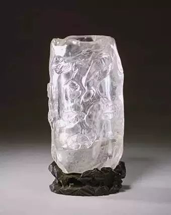 笔筒以水晶琢成,于晶莹剔透的质地上雕饰松猿图,极富自然情趣。