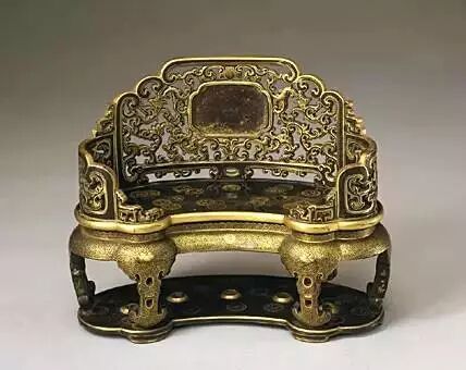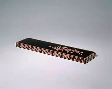 笔架宝座式,遍体髹黑漆,分部位饰描金缠枝花叶纹、团花纹及山水楼阁图景,座面开5个圆孔,托泥上对应做5个凹槽,用以插笔。宝座形笔架在清宫中仅见此一件,装饰风格亦独特。