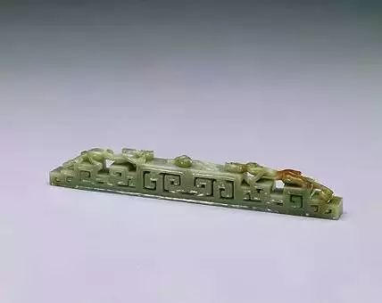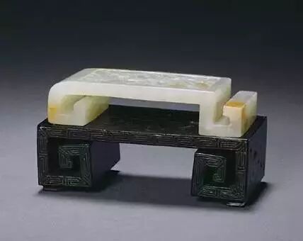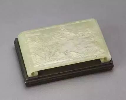 墨床青玉质,长方形卷书式。床面浮雕山水图,碾琢精细,宛然一幅微形的文人画卷,配以淡淡的、润泽的青色,小巧而致雅。此为清宫廷造办处玉作制品。