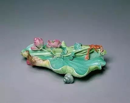 盘呈荷叶形,叶面翻卷起伏,叶梗从叶后过枝而上,叶面边缘处贴塑含苞待放的花苞与莲实,莲籽可以在莲蓬中自由活动,器底粘有田螺和菱角形的足。底书“乾隆年制”青花四字篆书款。此器造型、釉色均刻意摹仿自然界中的实物,显示出当时粉彩象生瓷器高超的工艺水平。
