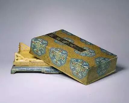 盒长方形,天盖地式,下承连体束腰形座。通体在黄色锦纹地上饰团花,顶面中心作长方形书签,其内黑地铜镀金隶书“戢武敷文”。此盒装饰纹样取锦上添花之意。