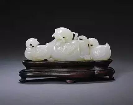 笔架青玉质,形为三鹅相连,分别衔谷穗、花枝,鹅腹下饰小浮萍。“三鹅”是印度婆罗门教中月天(月神)的坐骑。中国古人对洁身自好、风度翩翩的鹅亦颇喜爱,古代以鹅为题材的工艺品为数甚多。