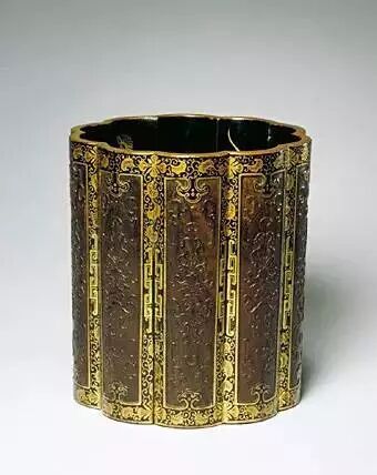 笔筒椰子木制,十瓣式筒身髹黑漆饰描金花卉纹,每一凸瓣均留有长方形开光,开光内在原木地上浅浮雕变体几何纹。内壁满髹黑漆,并以金漆描画各式折枝花草纹。底部亦为黑漆地描金花卉纹。此器所应用的漆工艺似受日本金漆莳绘的影响,较为特别。黑漆描金艳丽悦目,而木色沉暗蕴藉,相互衬托之下,装饰效果更为突出。
