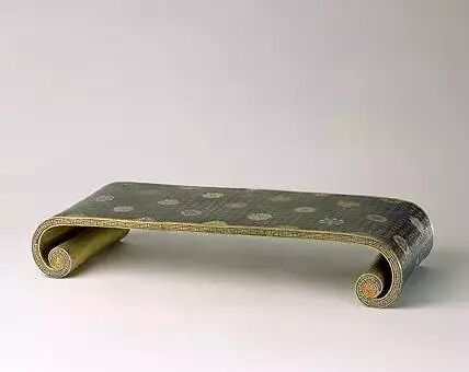 小几为置于书案上的小型陈设,增添了案上的空间层次。此几小巧玲珑,虽为铜胎但造型却显轻盈,修饰地色沉着,花纹规整,不求纹彩耀目抢眼,但富贵雅丽之气自足。