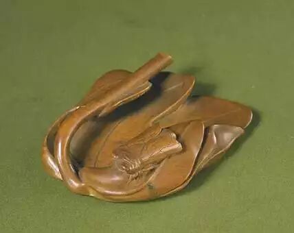 笔掭荷叶状,叶边卷起形成浅洗。正面阴刻叶之筋脉,背面阳刻叶之纹理,并以圆雕莲蓬、茨菇和田螺等为附足,将叶形洗托起。笔匣用以贮存新笔,置药其中以防蛀。清宫御用笔匣皆清乾隆、嘉庆两朝所作,大体分紫檀、文竹两种。
