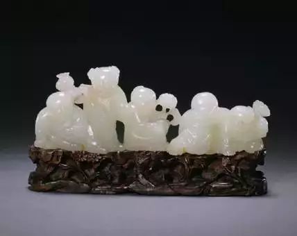 笔架青白玉质,雕琢姿态各异的五个童子,手中各持不同的花果枝叶,寓意“五子登科”。此笔架造型风格活泼,五子高低错落中洋溢着喜庆气氛。