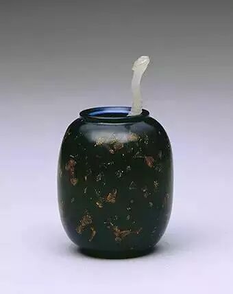 水丞玻璃质,吹制而成罐式。通体以海蓝色玻璃为胎体,外层满套透明宝蓝色玻璃,其内漫洒金星。玻璃质地细润纯净,光滑亮泽。此水丞通体金光闪烁,富丽精致。