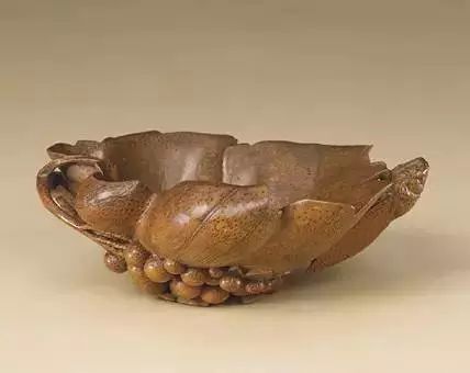 洗葡萄叶形,微拳如掌,纳水即成笔洗,外底又雕小叶和一束葡萄,以为底足。叶缘高处雕一蝉,蝉之足尖及薄翼皆刻画入微,栩栩如生,使人如闻其声,可见其时竹雕笔洗工艺之精湛娴熟。