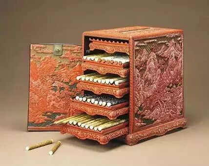 笔匣长方形,匣内巧做活动的上下五层拉屉。屉上分别卧有笔槽,每层可容纳10支毛笔,共50支成套。笔匣以红漆为主,黄、绿两色漆作锦地,通体雕饰江南山水图景,匣内屉座及匣底连体阔座均雕缠枝莲纹,匣顶中央回纹长方界栏内原嵌“天葩垂露”四字。雕饰层次清晰有致,远山近水,林木掩映,颇富诗情画意。整个漆匣色彩艳丽,雕工精细,为乾隆朝宫廷造办处剔红器之佳品。