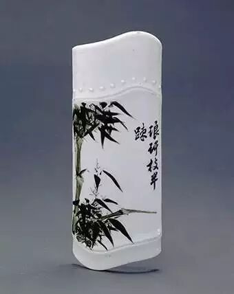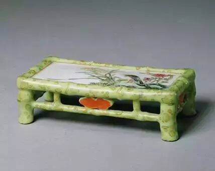 臂搁长方形,竹节式,通体施白釉,正面以墨彩绘竹叶纹,画右侧题五言诗句:“琅玕枝竿疏”。瓷质臂搁为文具中少见的品种。此器墨彩浓重,画意疏简而颇有神韵,具有清康熙朝墨彩瓷器的典型风格。