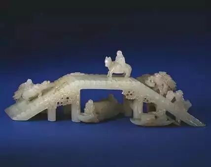 笔架作小桥形,桥上行人或骑驴,或担物,或赶牛运货,桥下有小船似正让大船先行通过桥洞。此笔架雕琢精细,景致生动,将民间的生活景象微缩在书案上,饶富情趣。