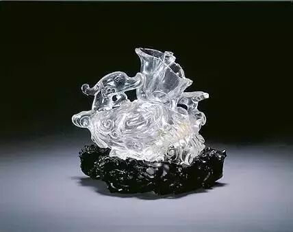 砚水壶白色透明水晶质。运用圆雕、浮雕和镂雕工艺塑造凫鸟和灵芝造型。凫身中空,背部有开口,灵芝内凹。其造型寓多福多寿之意。