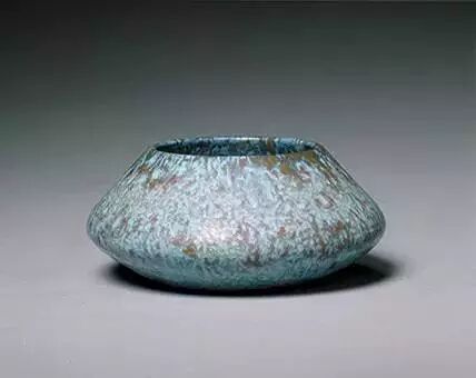 水丞敞口,折腹,圈足。足内阴刻“雍正年制”双行篆书款。内外均施炉钧釉。炉钧釉属低温窑变釉,入窑经二次烧成,是清雍正朝景德镇御窑厂创烧的仿钧釉品种。从传世品及档案记载反映出,雍正年款的炉钧釉以蓝、白,红、蓝等色相间交融,不同的窑内气氛烧成各种窑变釉面,变幻莫测。此件炉钧釉水丞造型新颖,形制小巧,实不多见。