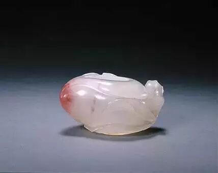 水丞白玛瑙质,半透明,局部有红色。器作桃形,内空。器外装饰镂雕枝叶。此器运用巧做技法将料中的红色恰好置于桃尖上,生动逼真。此水丞匠意十分讨巧,玛瑙光莹润泽的材质与桃的造型相结合,仿佛传说中天上的仙桃落于书案,突出了仙寿的吉祥寓意。