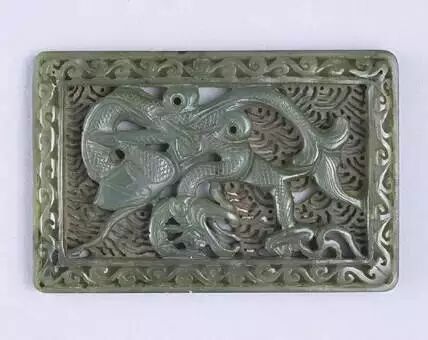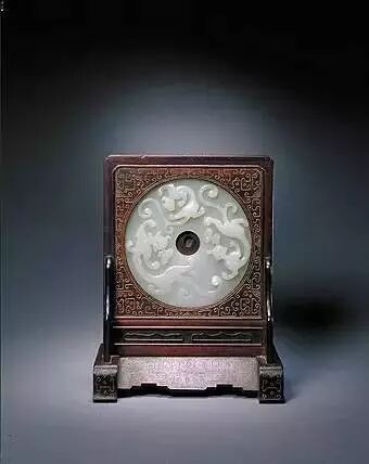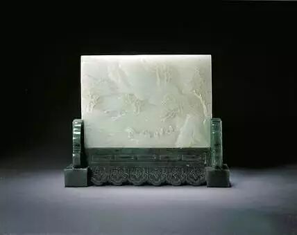 屏青玉质。正面凸雕“渔樵耕读”的故事题材。背面屏心光素,饰回纹花边。碧玉仿木形式屏座。古人以玉象征君子之德,故此屏采用青玉之质正与所琢故事之旨相映合。