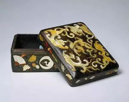 盒体硬木质,长方形,镶嵌金丝、螺钿、玛瑙以及填漆等为纹饰,用料考究,作工精美。盒盖面饰5只夔龙,舒展飘逸。盒立壁四面对称镶嵌团鹤、折扇、花卉、双鱼、葫芦、荷叶、盖罐、如意等杂宝纹,寓意吉祥。盒内以蓝绢衬底,应为盛册页用。