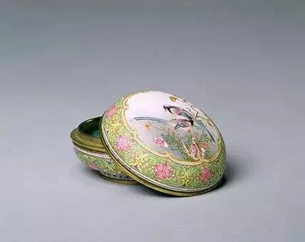 盒圆形,子母口,盖隆起,圈足。盖面作八瓣形开光,其内彩绘花鸟图,一枝蔷薇花朵簇生枝头,两只绶带鸟站立其上,顾盼对鸣。盖、盒立壁分别环饰朵花一周。足底中心蓝色双方框内书“乾隆年制”双竖行楷书款。此盒顶面虽小,却绘出工笔画般的景物,用笔精准,色彩渲染清朗,当为宫内造办处的高手绘制。