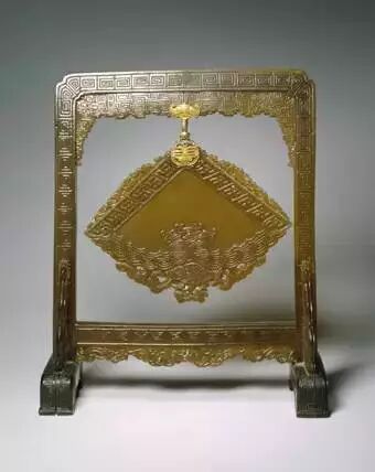 屏白玉质,外方内圆形,饰三螭。屏配紫檀木座,前后饰阴刻的变形夔龙纹,阴线内填金。木座后面饰阴刻填金,隶书乾隆帝御制诗一首,末有“几暇怡情”、“得佳趣”两枚篆书闲章。诗文填金,以座衬屏,是插屏中难得的精品。