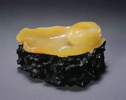 笔掭黄玛瑙质,卷边荷叶形,叶下花枝纵横,叶上托一小瓜,圆口,内空可盛水。此器材质优良,色泽鲜丽,雕刻精巧。