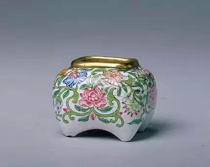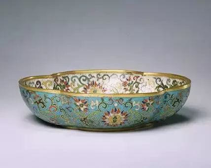 笔洗海棠花式,平底。内壁在白釉地上饰掐丝珐琅缠枝花卉纹,内底中心为一朵莲花,外壁在天蓝色地上饰缠枝花卉纹。此器掐丝均匀,色彩纯正,镀金光亮,做工精致,为乾隆朝的典型作品。