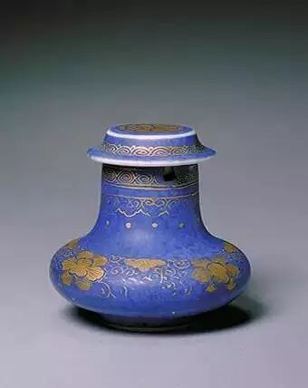 糊斗分盖、器两部分,均施洒蓝釉为地,描金为饰。其形制稳重大方,色调清雅,描金纹饰显露出皇家的富贵气派。