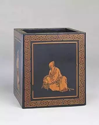 笔筒通体髹黑光漆,四角下设象牙足,外壁四面以文竹镶嵌边饰及高士人物图,表现文人清高雅洁之格调。此器纹饰简洁,黑漆地上嵌饰的文竹线条清晰有神,韵味清雅高古,风格醒目独特。