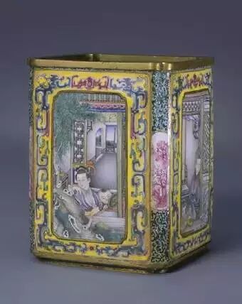 笔筒方体委角,四面在黄色珐琅釉地上饰红蝙蝠及蓝色蟠螭纹,中央长方形委角开光内绘凭窗母婴图,人物神态刻画得细腻生动,用笔工致,体现出乾隆朝人物题材画珐琅器的制作水平。
