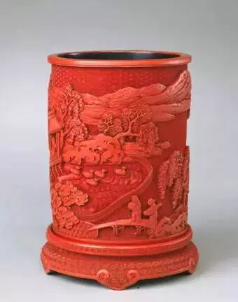 筒外壁景物虽多但层次清晰,器物上刻几种锦地以示不同的空间,意境恬淡深远。其漆层较厚,雕刻刀法精密,棱线深峻有力,纹饰清晰醒目,色泽艳丽。其刀法及图案风格均保持着乾隆时期雕漆的一些特点。底部髹黑漆,中心镌篆书“嘉庆年制”双行四字款。此笔筒为现知唯一具嘉庆款的雕漆作品。