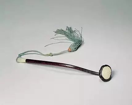 如意紫檀质,光洁圆滑,首部灵芝式,中嵌玉饰一块,砣出浅浮雕灵芝纹,尾端嵌青白玉饰。如意配蓝色丝穗及珊瑚珠。此如意虽只首、尾两镶,但形制设计显然来自清乾隆朝以后流行的三镶如意之影响。