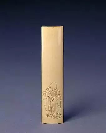 臂搁长形,呈覆瓦式。正面雕寿星,背面雕《九老图》,人物虽小如豆粒,却神情毕现。远处有云烟重峦,楼台隐现,收尺幅千里之功。此器正背面图案分别采用浅浮雕和高浮雕技法雕成,技法不同,繁简迥异,而祈寿之含意相同,清雅之韵致合一,是清代牙雕文房用具中的代表作之一。
