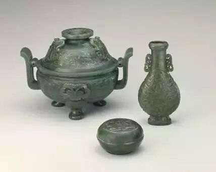 炉瓶盒三式一套,皆碧玉质,其中玉炉质地最佳。此套碧玉炉瓶盒三式,材质润泽,器型大方,纹饰古雅,是御书房中的熏香之具。