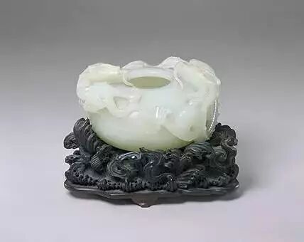 洗作束敛荷叶状,壁极薄,外底镂雕莲梗、水草作洗足,洗外缘又雕一鱼一螺附壁上。此玉笔洗粹美精致,清新雅洁,为清代和阗玉器之上品。